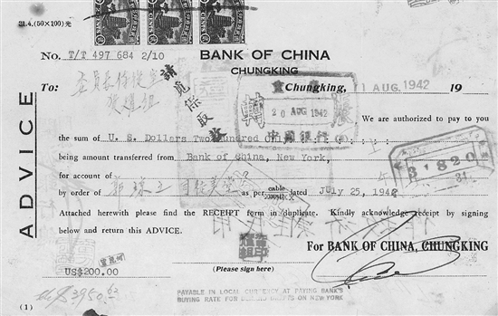 侨汇本是旅居国外的华侨从事劳动和各种职业所得,用以赡养国内亲属的汇款,是国家的重要外汇收入。1937年—1945年,全国侨汇收入约为7.5亿美元,其中美洲约为5.95亿美元,占79%。五邑籍华侨(尤其是被称为“金山伯”的旅美华侨)在美洲侨汇中占有巨大份额。资料显示,抗战前,台山年均接收侨汇3600万美元,抗战爆发后的1938年,台山侨汇更达1.8亿美元,为历年之最。一般而言,台山每年的侨汇收入约占广东省的一半。因此,抗战期间,五邑籍华侨通过侨汇对祖国抗战事业所作出的贡献同样非常突出。