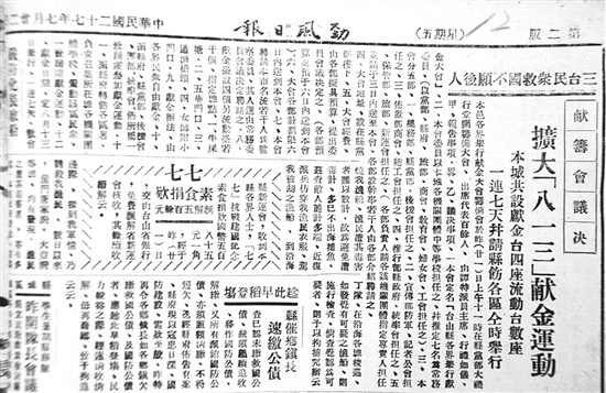 该报另一篇报道为《本城献金台 第五天献金录》。文中详细记录了献金的地点、人物、献金的数额:“革新路(十七日)台山自卫集训大队国币七十二元六毫另广东铜仙六枚、六岁小童饶棣棣毫券六毫……汉师奶毫券三十元、台山造饼工会毫券十元、台师附小省币十元、谭达鋈纹银戒指一枚……女师附小(十七日)台城消防队国币五元、远怡母省券一元、谭华盛纹银颈钳一只……”