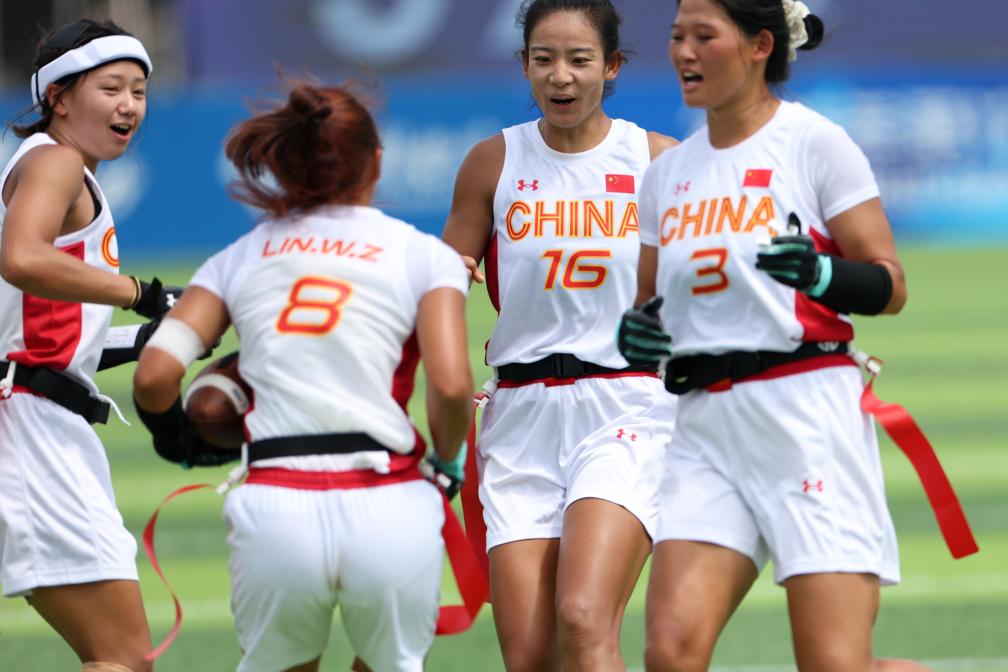 8月14日,中国队球员庆祝得分。当日,2025年成都世运会腰旗橄榄球女子预赛A组比赛中,中国队45:47不敌奥地利队。新华社记者 陈斌 摄