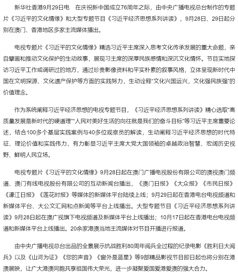 《习近平的文化情缘》《习近平经济思想系列讲读》在港澳多家主流媒体播出