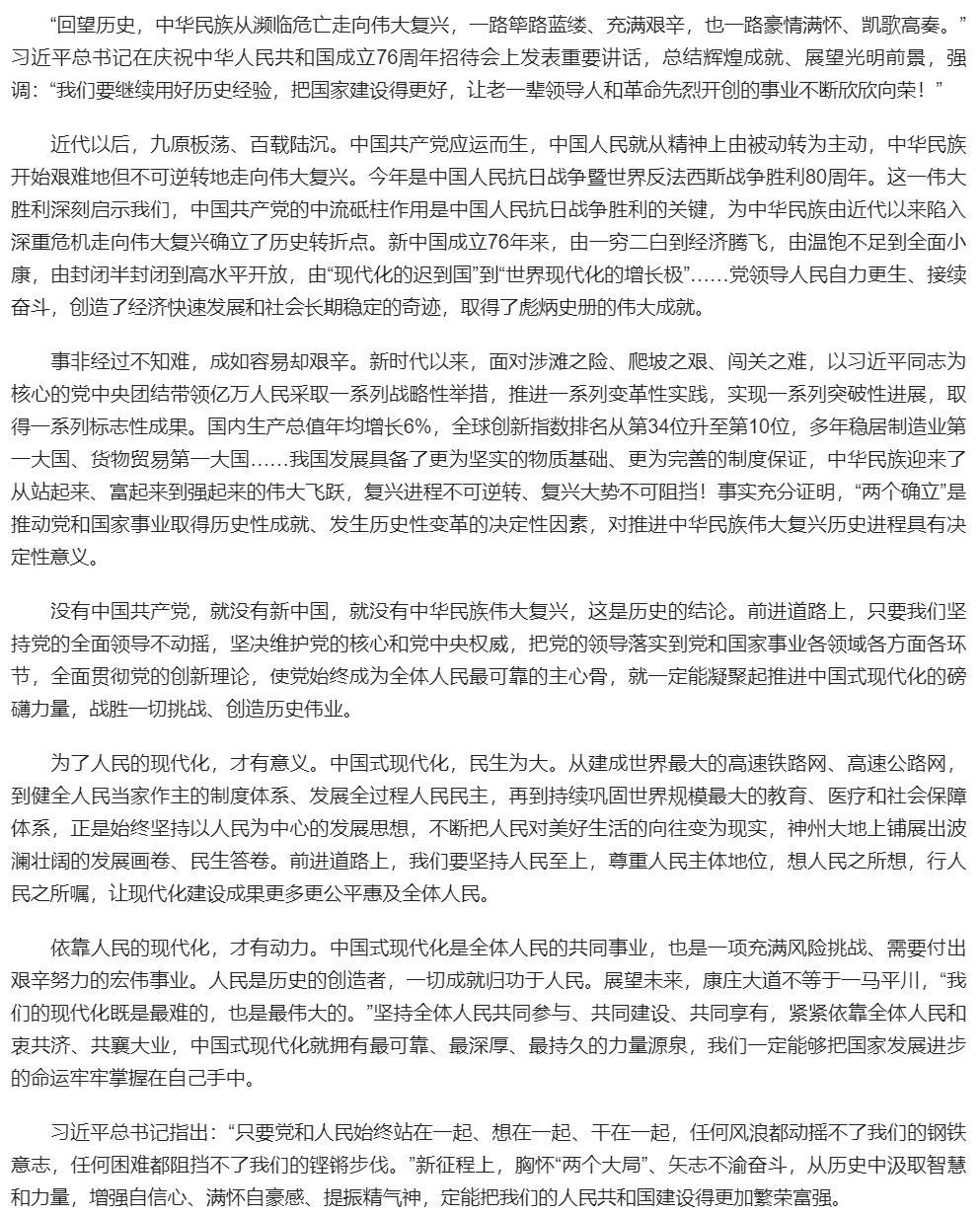 ——论学习贯彻习近平总书记在庆祝中华人民共和国成立76周年招待会上重要讲话