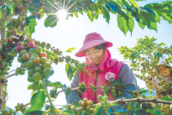 图为11月16日,咖农在云南省保山市隆阳区烫习村一处咖啡园采摘咖啡果。