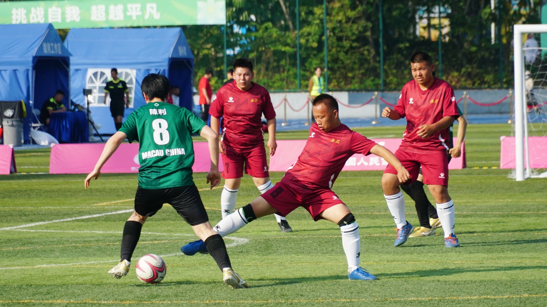 特奥足球运动员们奔跑、抢球,积极投入比赛。 郭永乐 摄