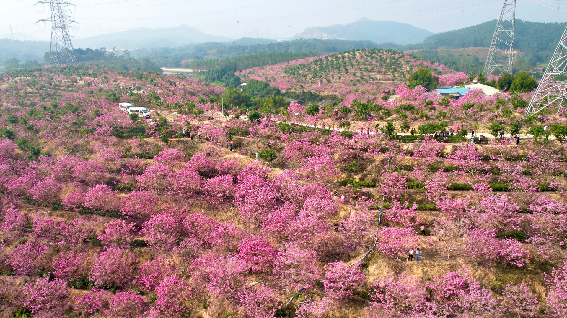 12月24日,鹤山莱苏(鸿园)山水人家旅游景区内,500余亩紫花风铃木迎来最佳观赏期。虽是工作日,但仍有不少广州、惠州等地的游客专程驱车前来,沿着观景步道漫步、拍照打卡。