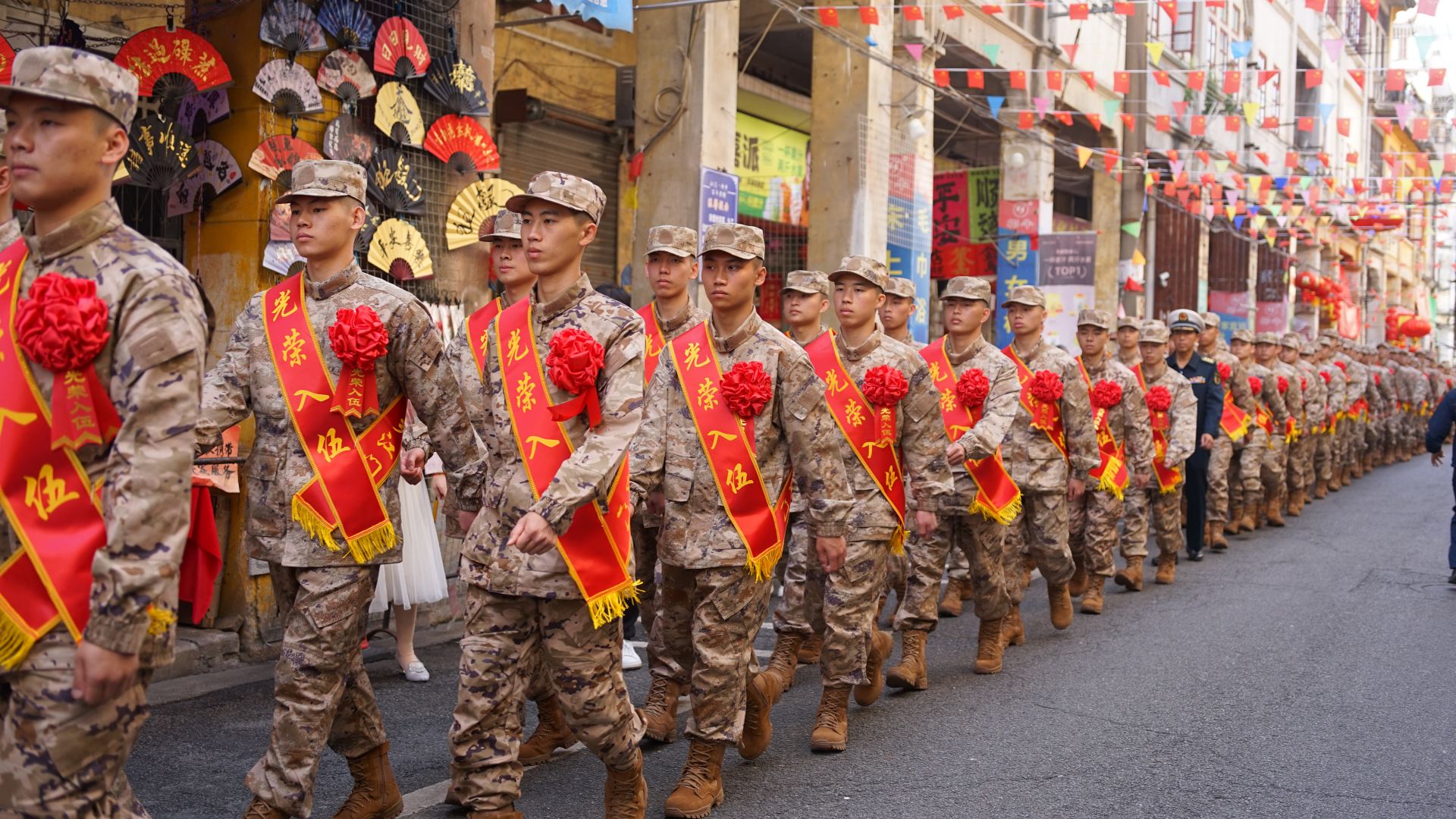 预定新兵到长堤历史文化街区巡游,精神抖擞。