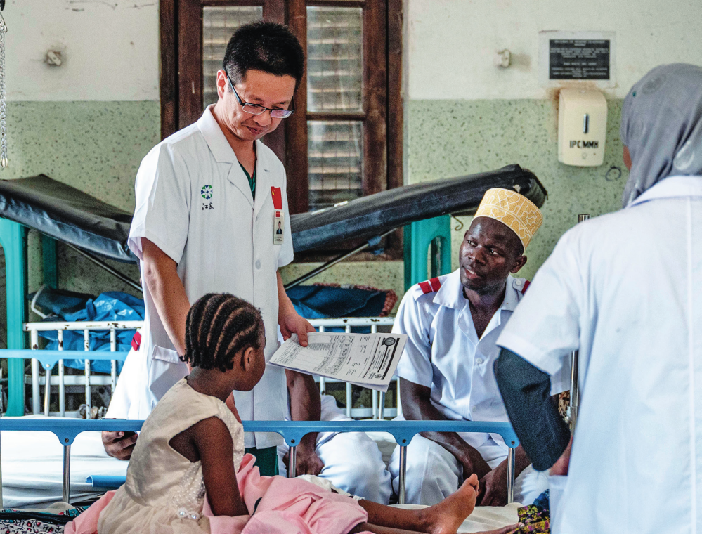 中国援桑给巴尔医疗队队长蒋国庆(左)在坦桑尼亚桑给巴尔的纳兹莫加医院查房(2023年12月29日摄)王冠森摄 / 本刊