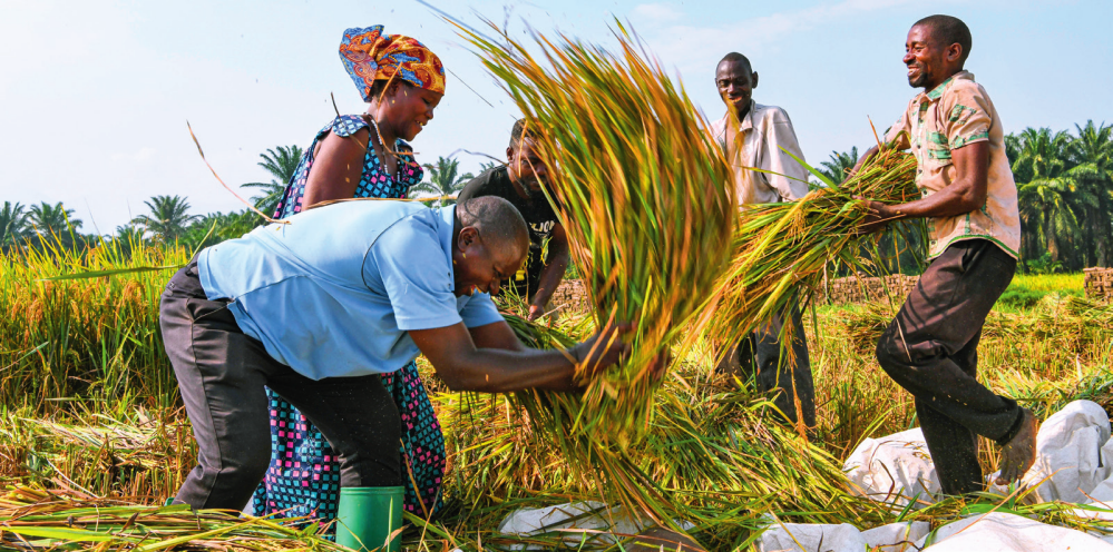 2018年,中国农业专家组在布隆迪布班扎省吉汉加县设立首个水稻减贫示范村。图为当地农户在稻田里给杂交水稻脱粒(2023年6月20日摄) 韩旭摄 / 本刊