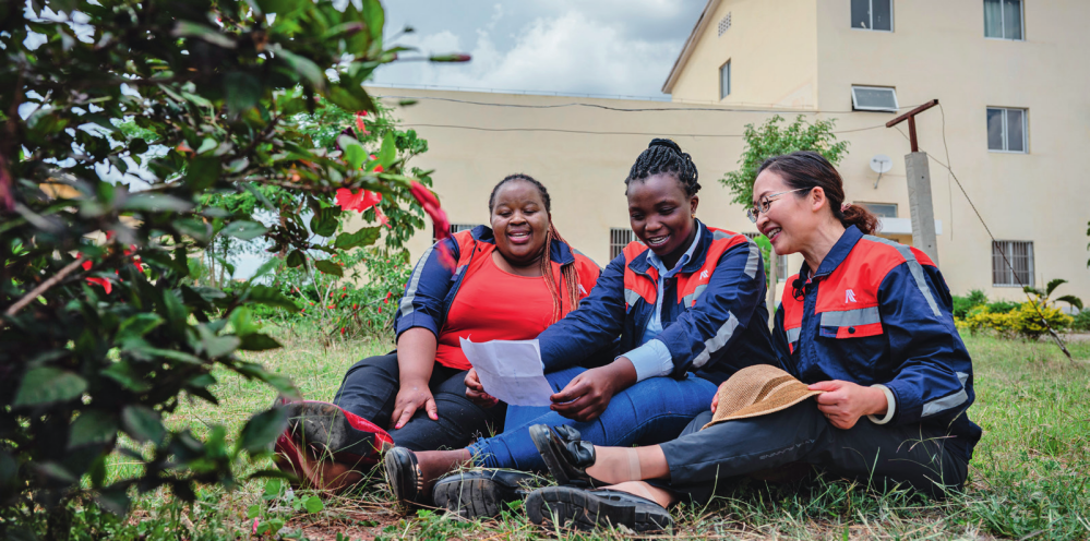 在肯尼亚内罗毕,非洲之星铁路运营公司工电部电子设备检修工区工长陈玲(右)在休息时教学员唱中文歌曲(2023年5月23日摄) 王冠森摄 / 本刊