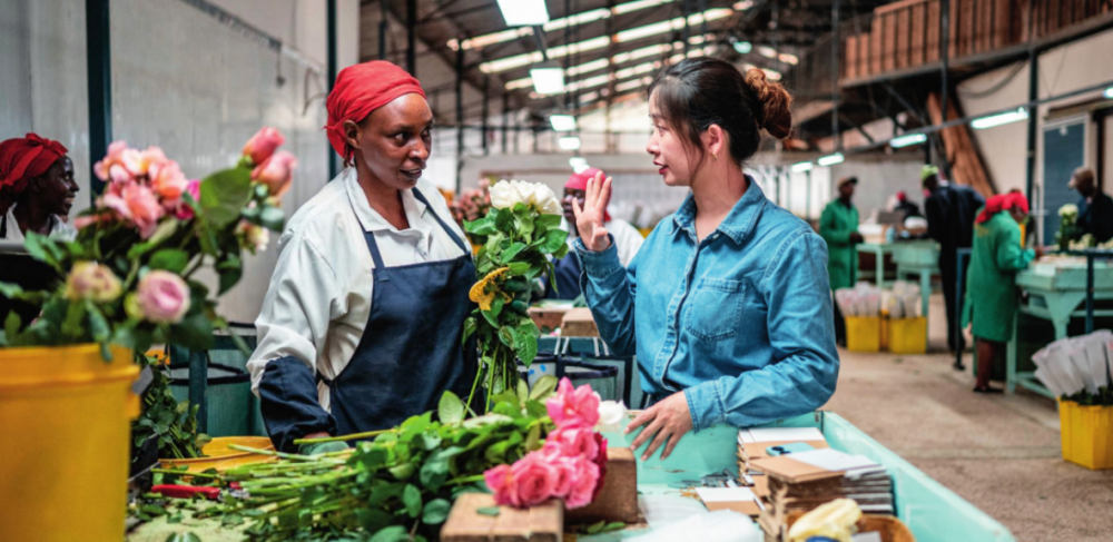 湖南玺悦国际贸易有限公司负责人黄梓楠(右)在肯尼亚纳纽基的坦布济花卉农场挑选鲜花(2024年5月18日摄)王冠森摄 / 本刊