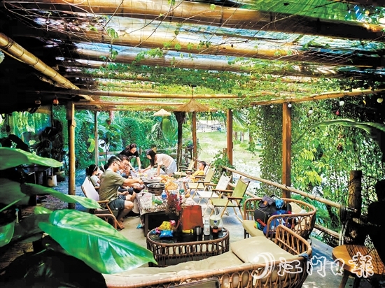 风河谷农庄内部最显眼的,莫过于使用木板、竹竿为架构打造的东南亚主题餐厅。餐厅大面积使用了阳光板,显得室内通透明亮,阳光透过藤蔓洒落在室内的桌椅、绿植上,营造出了宁静的氛围。当然,餐厅最吸引游客的还是手抓海鲜等特色菜。“东南亚特色菜别具风味,更加吸引年轻人打卡品尝。”杨先生表示。