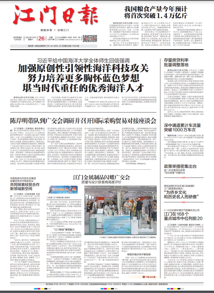 - ① 凡本网注明"稿件来源:江门日报"的所有文字、图片和音视频稿件,版权均属江门日报社所有,任何媒体、网站或个人未经本网协议授权不得复制或转载。已经本网协议授权的媒体、网站,在下载使用时必须注明"稿件来源:江门日报",违者本网将依法追究责任。