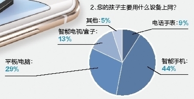 在设备使用方面,家长们普遍拥有的智能手机(占比44%)成了学龄前儿童最常用的上网设备。其次是平板电脑/电脑(占比29%),智能电视/盒子(占比13%)、电话手表(占比9%)等使用的孩子相对较少。