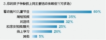 学龄前儿童在网络上的主要活动集中在娱乐方面。观看动画片或儿童节目占据了主导地位,占比高达60%;刷短视频也颇为流行,占比35%;玩游戏同样是孩子们常见的网络活动,占比32%。此外,和亲友进行视频/聊天(占比25%)以及线上学习(占比20%)也占有一定的比例。家住蓬江区的市民张海萍便提到,她的孩子虽然只有4岁,但已经有一年多的“网龄”:“他能在手机屏幕上娴熟地滑动,观看短视频。如果不制止,可以连续刷几个小时的短视频,完全没有自我控制的意识。”