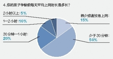 从调查问卷的结果来看,学龄前儿童上网时长总体上是可控的。15%的孩子很少或者没有上网,50%的孩子每天平均上网时间少于30分钟,20%的孩子上网时间在30分钟到1小时之间。然而,仍然有10%的孩子上网时间在1—2小时之间,5%的孩子甚至每天上网超过2小时。这提醒我们需要进一步关注并引导学龄前儿童的健康上网行为。