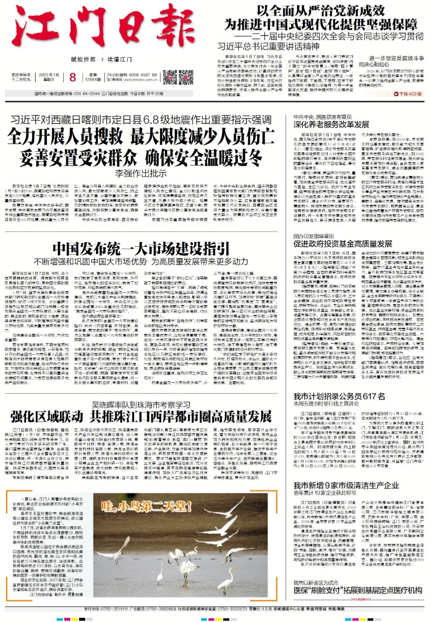 - ① 凡本网注明"稿件来源:江门日报"的所有文字、图片和音视频稿件,版权均属江门日报社所有,任何媒体、网站或个人未经本网协议授权不得复制或转载。已经本网协议授权的媒体、网站,在下载使用时必须注明"稿件来源:江门日报",违者本网将依法追究责任。