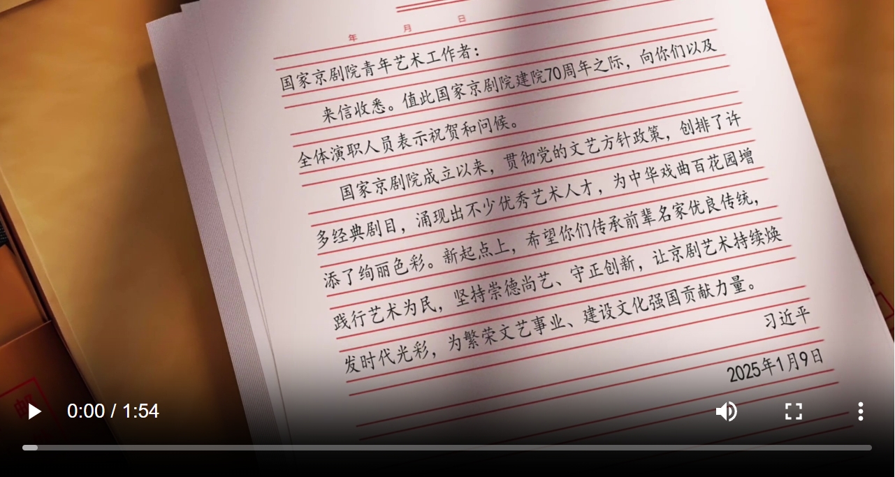 近日,中共中央总书记、国家主席、中央军委主席习近平给国家京剧院青年艺术工作者回信,在国家京剧院成立70周年之际,向全体演职人员表示祝贺和问候。
