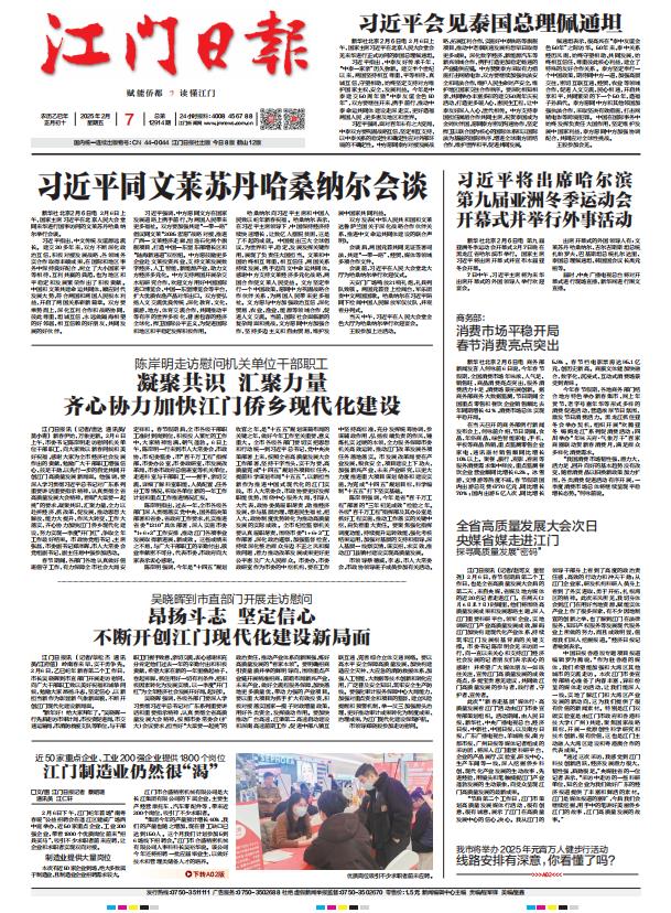 - ① 凡本网注明"稿件来源:江门日报"的所有文字、图片和音视频稿件,版权均属江门日报社所有,任何媒体、网站或个人未经本网协议授权不得复制或转载。已经本网协议授权的媒体、网站,在下载使用时必须注明"稿件来源:江门日报",违者本网将依法追究责任。