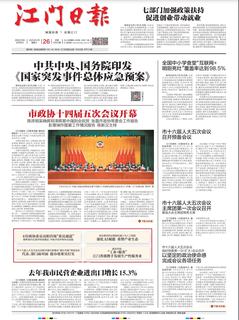 - ① 凡本网注明"稿件来源:江门日报"的所有文字、图片和音视频稿件,版权均属江门日报社所有,任何媒体、网站或个人未经本网协议授权不得复制或转载。已经本网协议授权的媒体、网站,在下载使用时必须注明"稿件来源:江门日报",违者本网将依法追究责任。