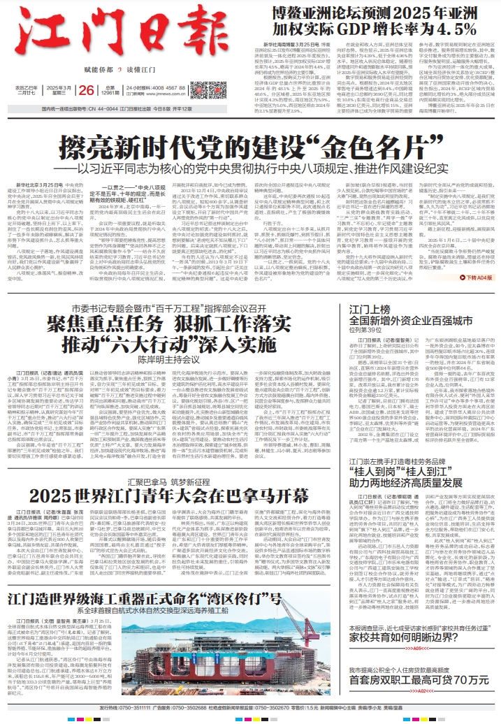 - ① 凡本网注明"稿件来源:江门日报"的所有文字、图片和音视频稿件,版权均属江门日报社所有,任何媒体、网站或个人未经本网协议授权不得复制或转载。已经本网协议授权的媒体、网站,在下载使用时必须注明"稿件来源:江门日报",违者本网将依法追究责任。