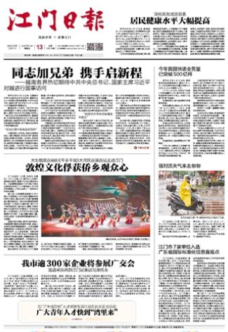 - ① 凡本网注明"稿件来源:江门日报"的所有文字、图片和音视频稿件,版权均属江门日报社所有,任何媒体、网站或个人未经本网协议授权不得复制或转载。已经本网协议授权的媒体、网站,在下载使用时必须注明"稿件来源:江门日报",违者本网将依法追究责任。