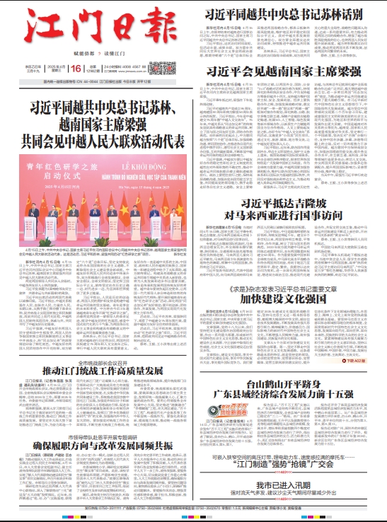 - ① 凡本网注明"稿件来源:江门日报"的所有文字、图片和音视频稿件,版权均属江门日报社所有,任何媒体、网站或个人未经本网协议授权不得复制或转载。已经本网协议授权的媒体、网站,在下载使用时必须注明"稿件来源:江门日报",违者本网将依法追究责任。