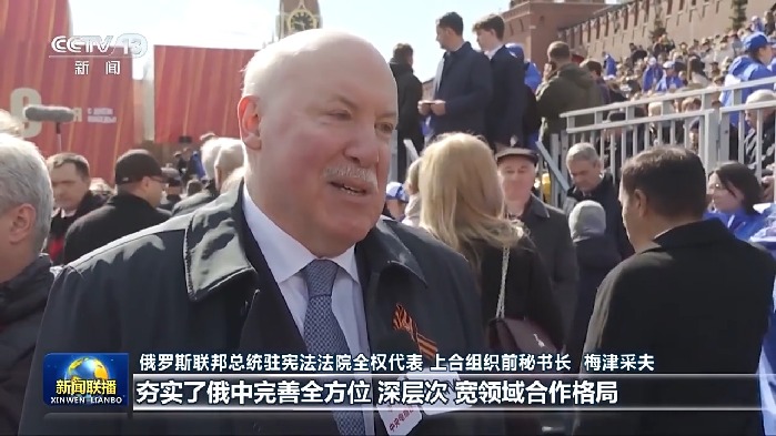 俄罗斯联邦总统驻宪法法院全权代表 上合组织前秘书长 梅津采夫:习近平主席此次对俄罗斯进行国事访问并出席胜利日庆典意义重大,夯实了俄中完善全方位、深层次、宽领域合作格局,俄中两国关系树立了新型大国关系的典范。