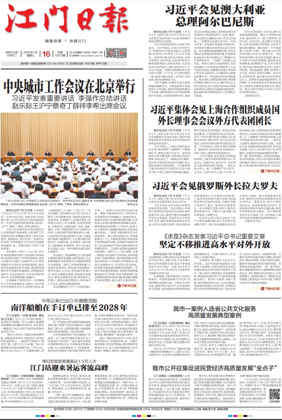 - ① 凡本网注明"稿件来源:江门日报"的所有文字、图片和音视频稿件,版权均属江门日报社所有,任何媒体、网站或个人未经本网协议授权不得复制或转载。已经本网协议授权的媒体、网站,在下载使用时必须注明"稿件来源:江门日报",违者本网将依法追究责任。