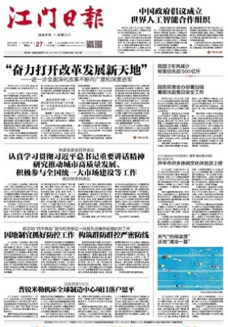 - ① 凡本网注明"稿件来源:江门日报"的所有文字、图片和音视频稿件,版权均属江门日报社所有,任何媒体、网站或个人未经本网协议授权不得复制或转载。已经本网协议授权的媒体、网站,在下载使用时必须注明"稿件来源:江门日报",违者本网将依法追究责任。