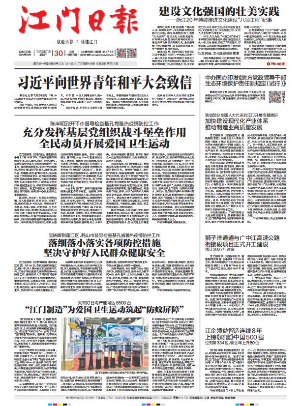- ① 凡本网注明"稿件来源:江门日报"的所有文字、图片和音视频稿件,版权均属江门日报社所有,任何媒体、网站或个人未经本网协议授权不得复制或转载。已经本网协议授权的媒体、网站,在下载使用时必须注明"稿件来源:江门日报",违者本网将依法追究责任。