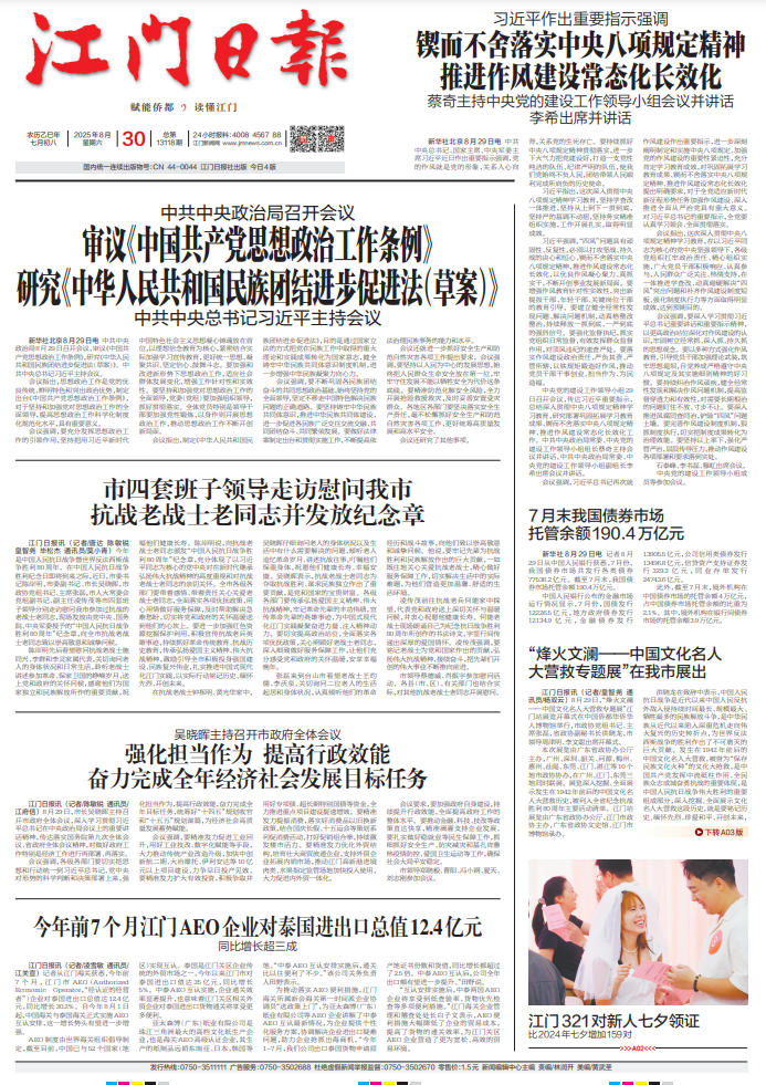 - ② 本网未注明"稿件来源:江门日报"的文/图等稿件均为转载稿,如其他媒体、网站或个人从本网下载使用,必须保留本网注明的"稿件来源",并自负版权等法律责任。