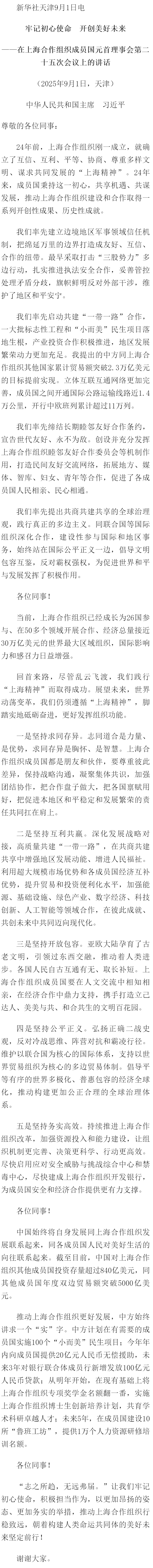 上合组织天津峰会|习近平在上海合作组织成员国元首理事会第二十五次会议上的讲话(全文)