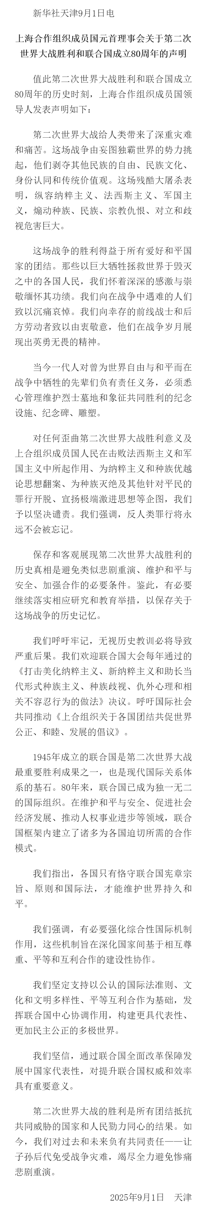 上合组织天津峰会|上海合作组织成员国元首理事会关于第二次世界大战胜利和联合国成立80周年的声明