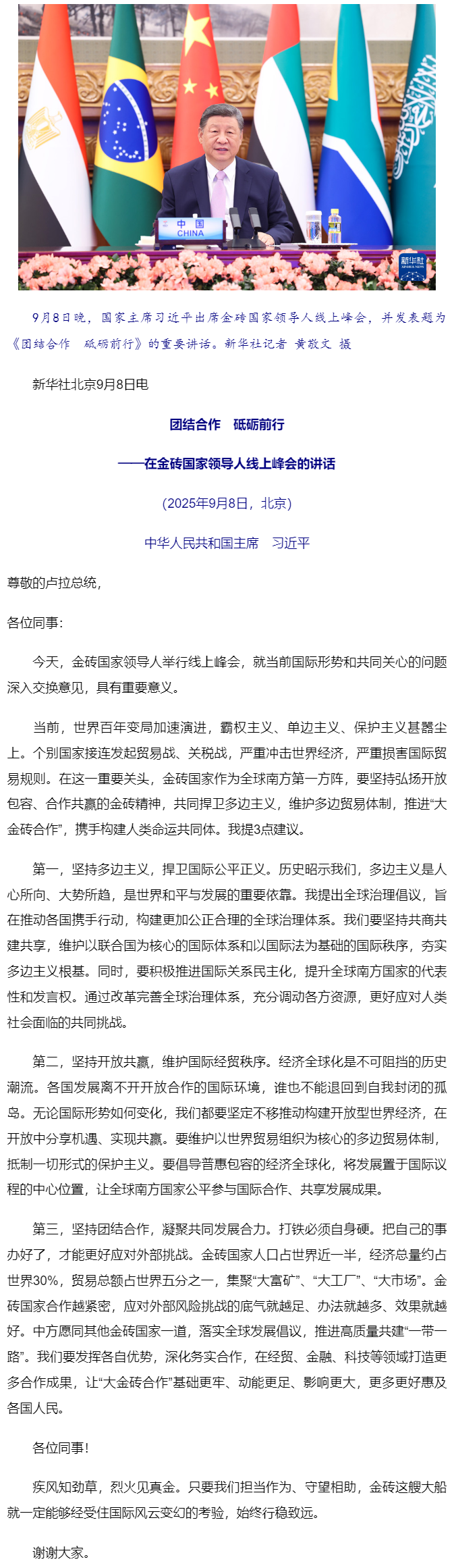 习近平在金砖国家领导人线上峰会的讲话(全文)