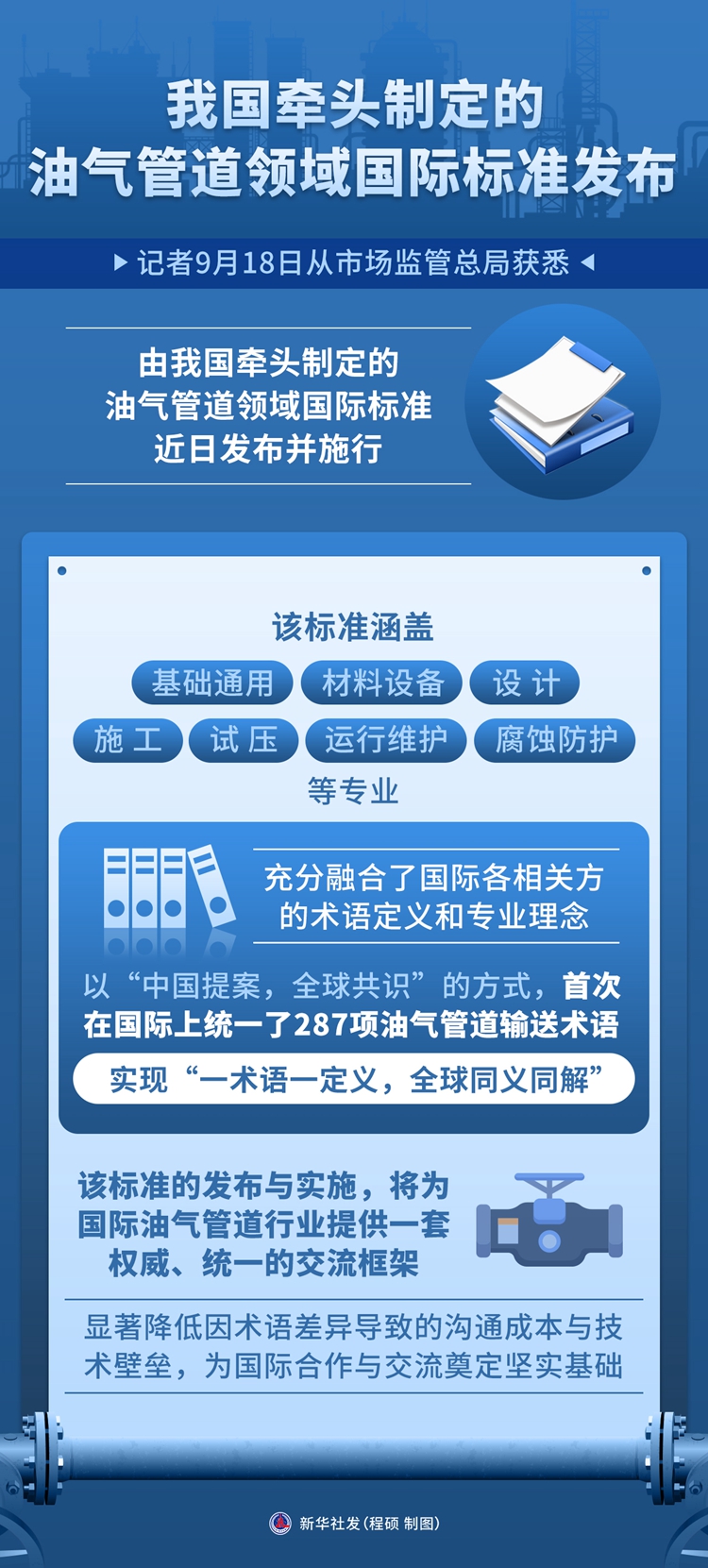 新华社北京9月18日电(记者赵文君)记者18日从市场监管总局获悉,由我国牵头制定的油气管道领域国际标准近日发布并施行。
