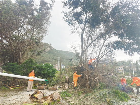在上川岛、下川岛,各方抢险救援力量已陆续到位。图为交通系统工作人员正在清理倒伏树木,全力恢复交通。毕松杰 摄