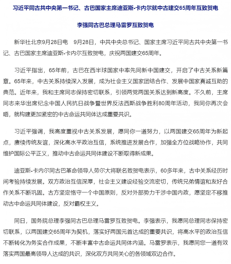 习近平同古共中央第一书记、古巴国家主席迪亚斯-卡内尔就中古建交65周年互致贺电