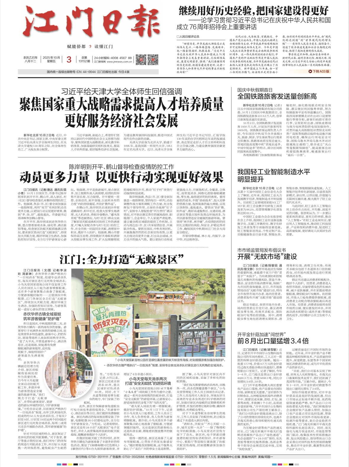- ① 凡本网注明"稿件来源:江门日报"的所有文字、图片和音视频稿件,版权均属江门日报社所有,任何媒体、网站或个人未经本网协议授权不得复制或转载。已经本网协议授权的媒体、网站,在下载使用时必须注明"稿件来源:江门日报",违者本网将依法追究责任。