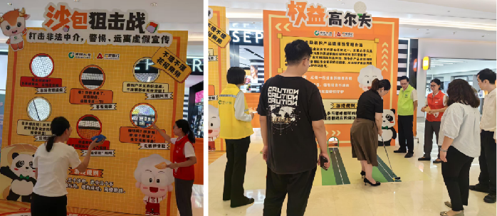 “消保快闪店”区域以时尚陈列形式呈现防范非法中介、保护个人信息、理性投资等主题展板,市民可观看学习,领取参与游戏的“通行券”,完成游戏挑战后兑换礼品,实现学习与激励的良性循环。