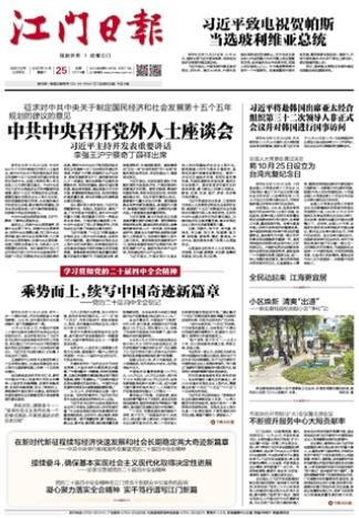 - ① 凡本网注明"稿件来源:江门日报"的所有文字、图片和音视频稿件,版权均属江门日报社所有,任何媒体、网站或个人未经本网协议授权不得复制或转载。已经本网协议授权的媒体、网站,在下载使用时必须注明"稿件来源:江门日报",违者本网将依法追究责任。