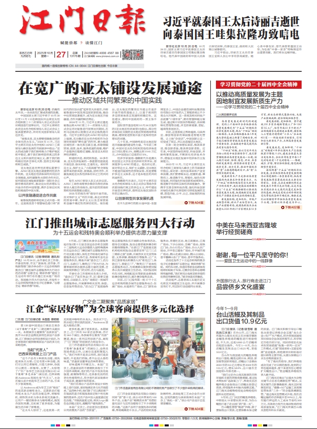 - ① 凡本网注明"稿件来源:江门日报"的所有文字、图片和音视频稿件,版权均属江门日报社所有,任何媒体、网站或个人未经本网协议授权不得复制或转载。已经本网协议授权的媒体、网站,在下载使用时必须注明"稿件来源:江门日报",违者本网将依法追究责任。