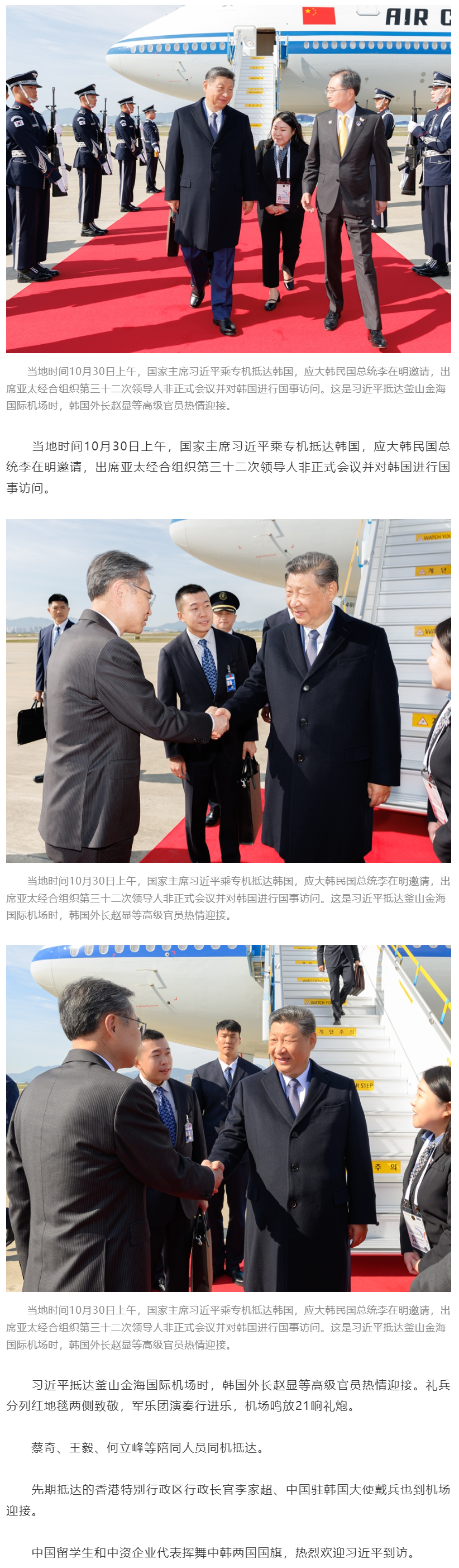习近平抵达韩国出席亚太经合组织第三十二次领导人非正式会议并对韩国进行国事访问