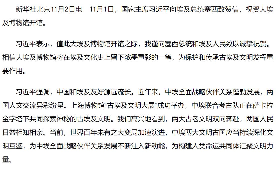 习近平就大埃及博物馆开馆向埃及总统塞西致贺信