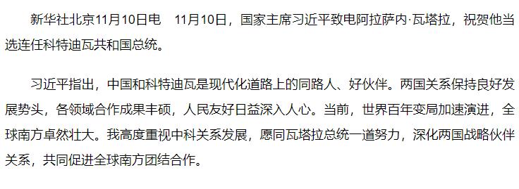 习近平致电祝贺瓦塔拉当选连任科特迪瓦总统