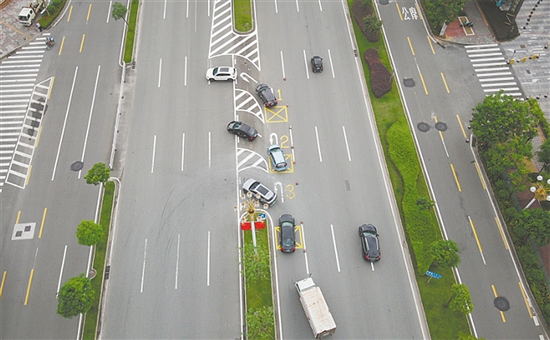 “‘多车串联掉头’指在掉头车道设置多个掉头车位,多辆车可以在不同的车位同时掉头。”江门交警相关负责人表示,该通道可同时容纳3辆车进行掉头操作,有效提高了路口的通行能力。