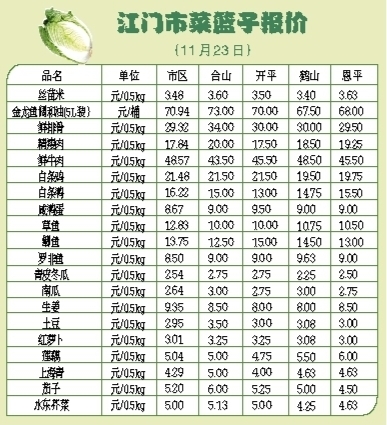 蔬菜类商品价格普遍下降。所监测的蔬菜商品价格波动情况为6涨23跌3平,综合零售均价为5.35元/0.5kg,环比下降1.30%,其中涨幅居前的品种包括苦瓜、蒜薹、大白菜,零售均价分别为6.26元/0.5kg、8.80元/0.5kg、3.30元/0.5kg,环比分别上涨3.81%、1.97%、0.92%;跌幅靠前的品种为莴笋、黄瓜、西洋菜,零售均价分别为5.83元/0.5kg、4.89元/0.5kg、5.88元/0.5kg,环比分别下降7.17%、5.78%、4.70%。