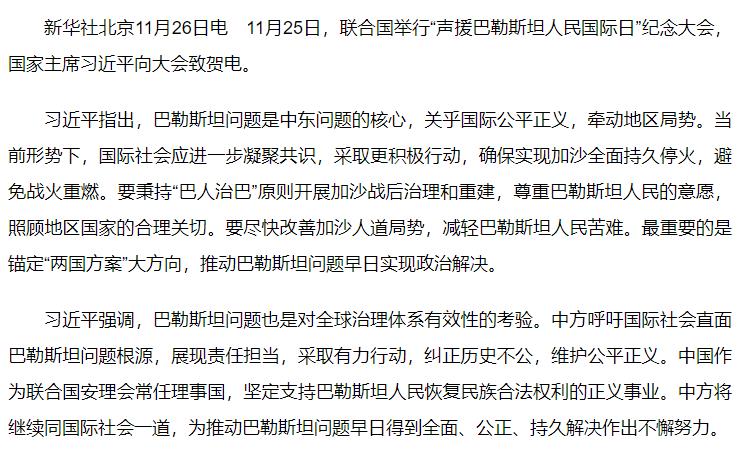 习近平向“声援巴勒斯坦人民国际日”纪念大会致贺电