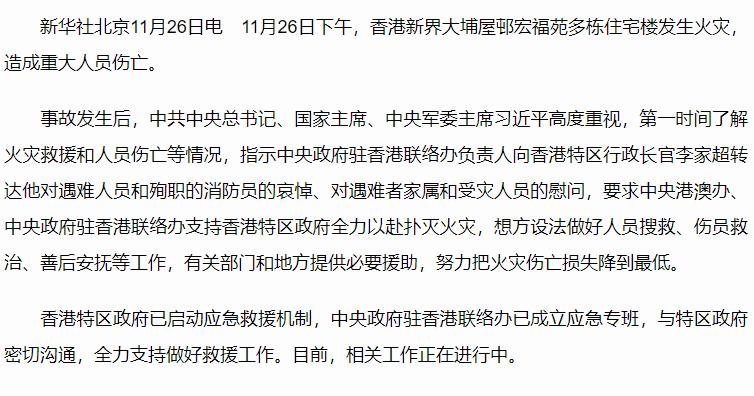 习近平向香港新界大埔区住宅楼重大火灾事故遇难人员和殉职的消防员表示哀悼 对遇难者家属和受灾人员表示慰问 要求全力以赴扑灭火灾 努力把火灾伤亡损失降到最低