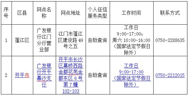 近年来,广发银行江门分行践行“征信为民”服务理念,不断提高征信服务水平,助力推进本地征信服务体系建设。截至目前,该行已分别在广发银行江门分行、广发银行开平幕沙支行布设个人征信报告自助查询机,提供个人信用报告查询服务。查询机查得的个人信用报告与人民银行查询机查询结果一致,广大市民群众可携带本人有效身份证就近前往查询点查询打印征信报告。具体查询地址及服务信息如下: