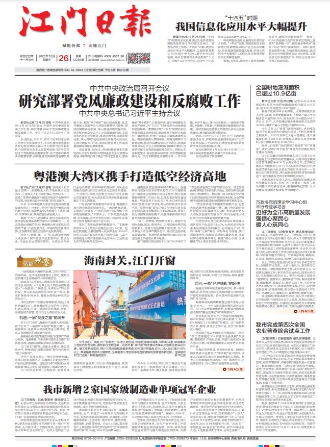 - ② 本网未注明"稿件来源:江门日报"的文/图等稿件均为转载稿,如其他媒体、网站或个人从本网下载使用,必须保留本网注明的"稿件来源",并自负版权等法律责任。