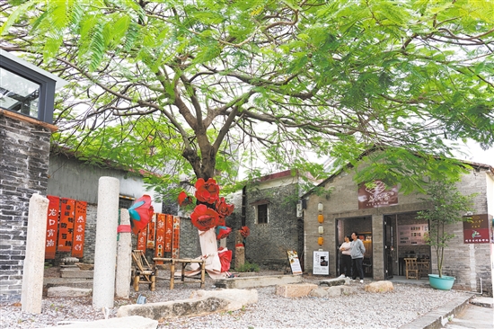 良好的村容村貌,为霄南村大力发展文旅产业打下了坚实的基础。龙口镇紧紧围绕“百千万工程”有关要求,推动霄南村深挖本土优势资源,积极开展招商引资工作,通过“户主收租+政府托管+社会经营”的模式,委托鹤山市富盛物业管理有限公司整合村内30多间闲置青砖屋并实施统一管理,为商户提供场地基础。
